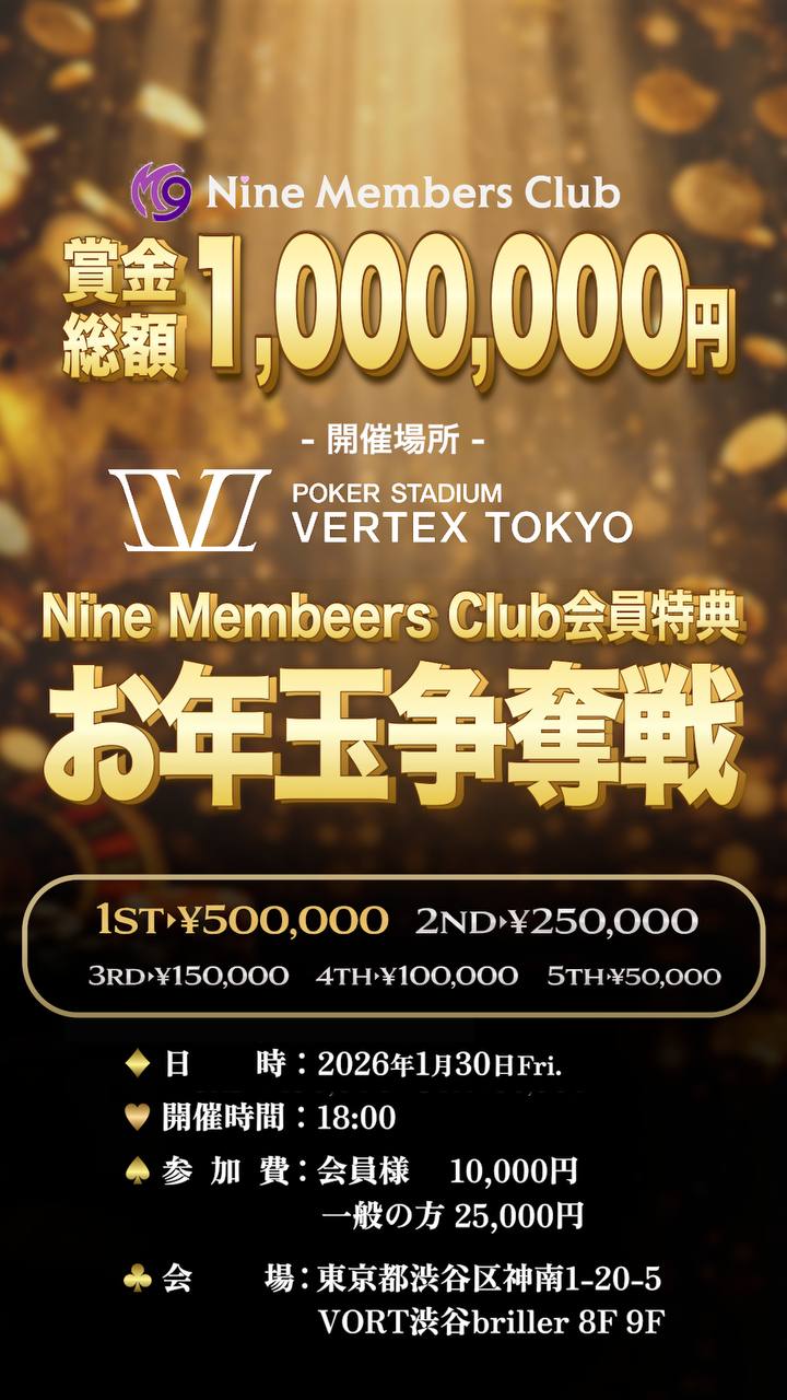 Nine Members Clubでは、2026年最初の会員特典イベントとして、賞金総額100万円を懸けたポーカートーナメント「お年玉争奪戦」を開催いたします。 本イベントは、会員様はもちろん、一般の方もご参加いただけるオープン形式のトーナメントです。新年を飾る...