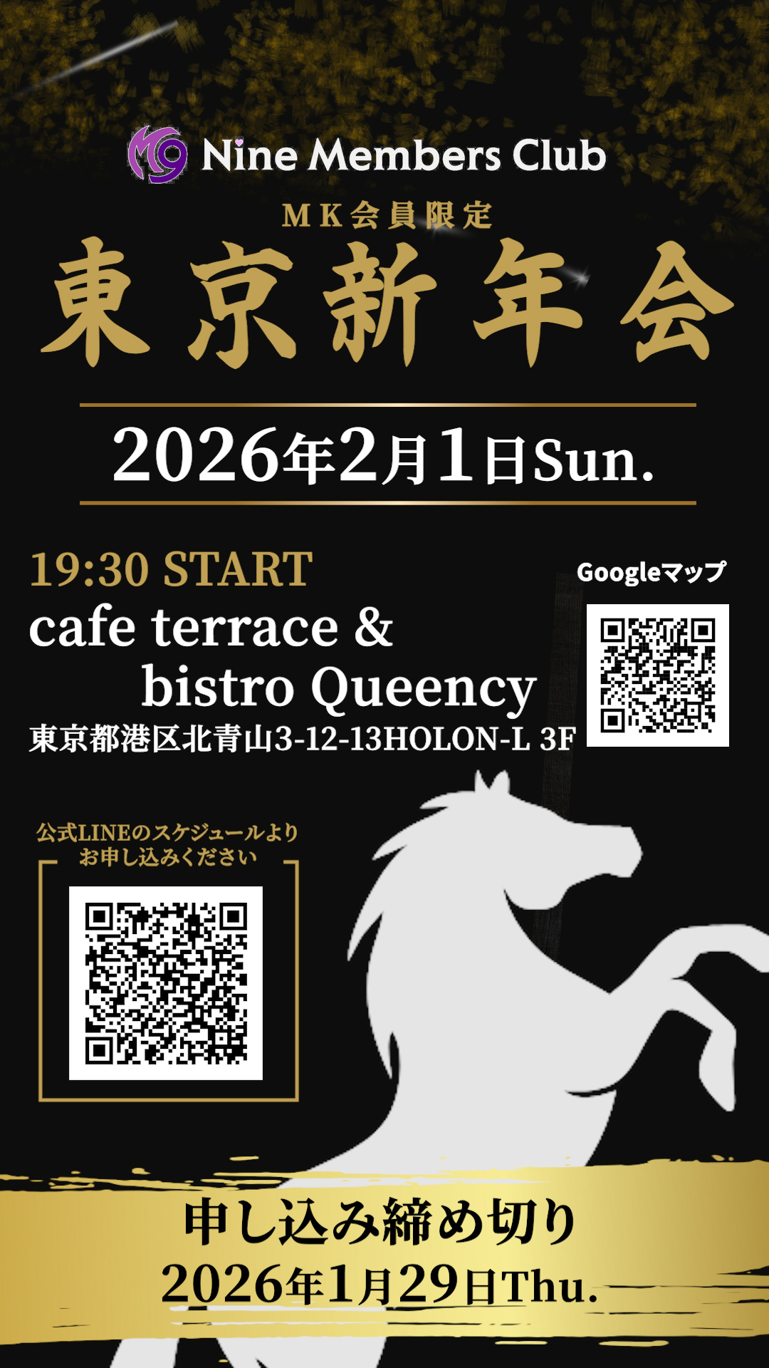 Nine Members Clubでは、会員様同士の交流を目的とした「東京新年会」を、2月1日(日)に開催いたします。 会場は、表参道エリアに位置する「cafe terrace&bistro Queency」です。落ち着いた空間で、会員の皆様とともに新たな年のスタートを祝うひとと... -