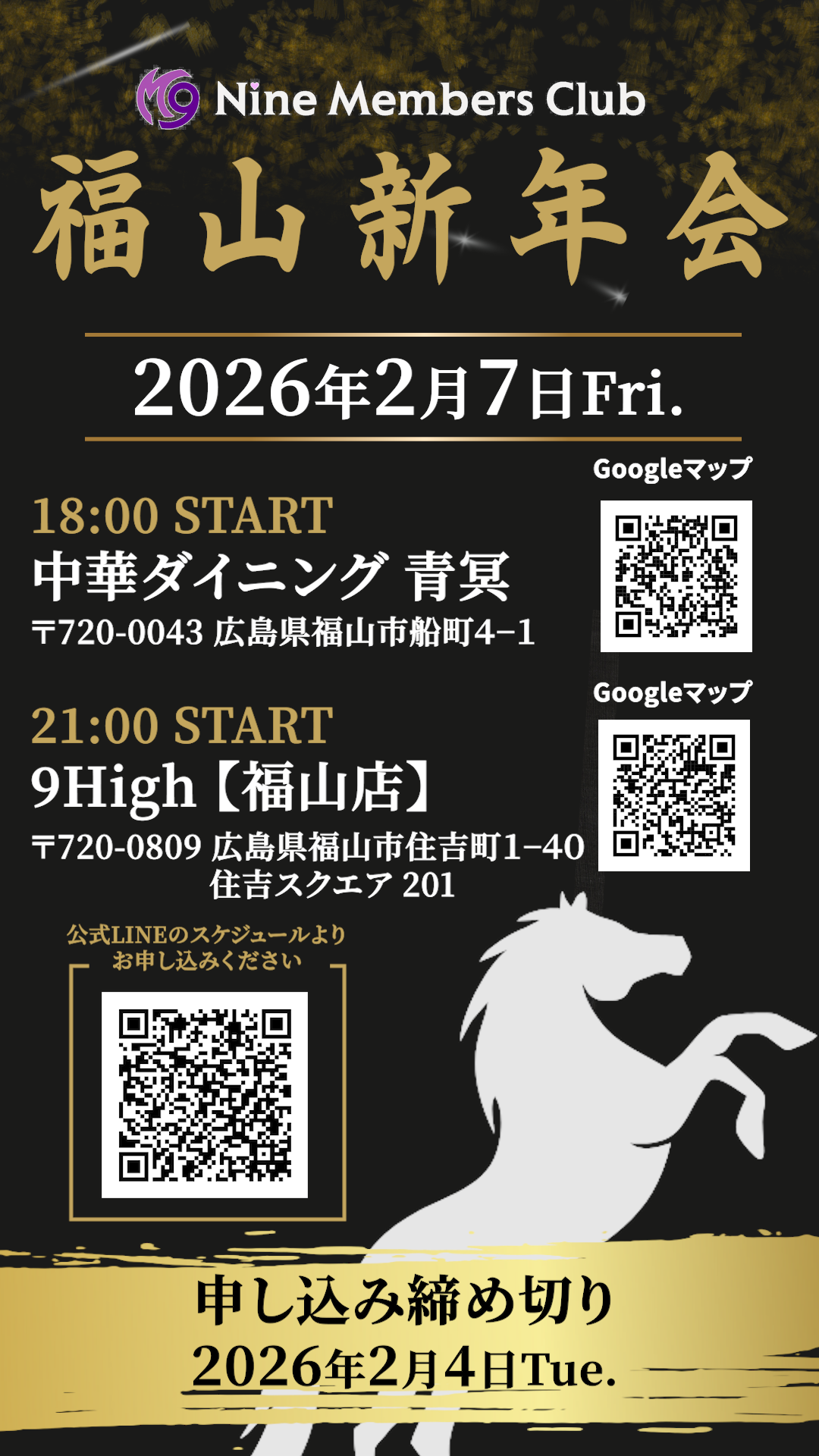 2/7(土)【会員限定】「Nine Members Club 福山新年会」開催のお知らせ