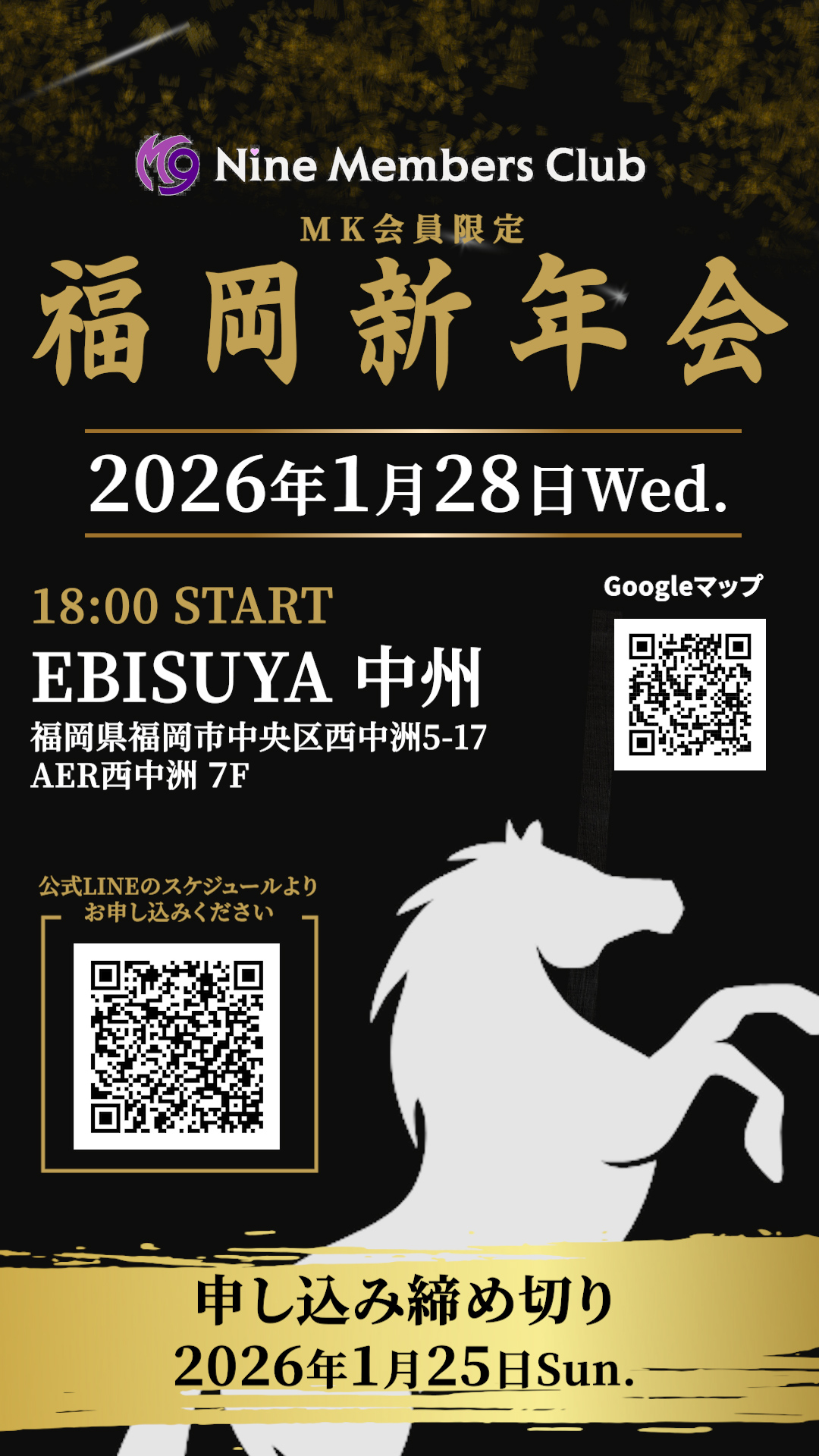 Nine Members Club会員の皆様を対象とした「福岡新年会」を、1月28日(水)に開催いたします。 本イベントは、会員様同士の親睦を深め、新たな年のスタートを共に祝う交流イベントです。西中洲エリアに位置する「EBISUYA」を会場に、皆様とともに特別なひ... -